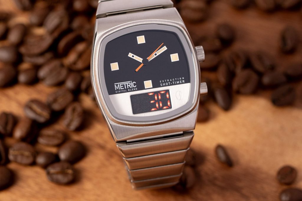 C’est là qu’intervient la Metric Digital Blend, l’une des montres les plus surprenantes que nous ayons vues cette année. Logée dans un boîtier Metric en acier inoxydable familier, la Digital Blend est la première montre ana-digi de Brew, un retour aux années 1980, et peut-être un minuteur espresso vraiment utile.